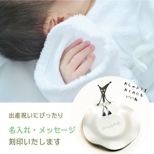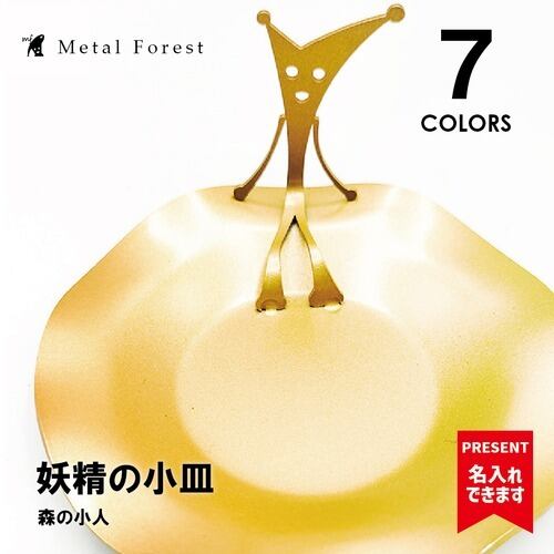 手のひらサイズの鉄製小皿に、可愛らしい妖精がちょこんと座ったデザインの作品です。表面には塗装を施し、アクセサリーや小物置きとしてお使いいただけます。さらに、お皿の部分にはレーザー彫刻を施し、お名前やメッセージ、誕生日ごとの花のデザインを入れることができます。
