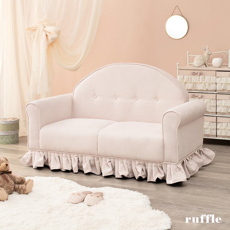 まるいフォルムとたっぷりのフリル、絶妙なピンク色がかわいい2人掛けソファ。
