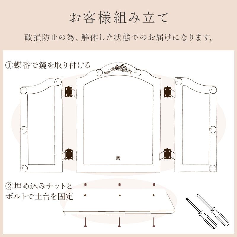 自宅のテーブルに置くだけで、本格的なLEDライト付き三面鏡ドレッサーに。メイクやヘアセットに大活躍。
