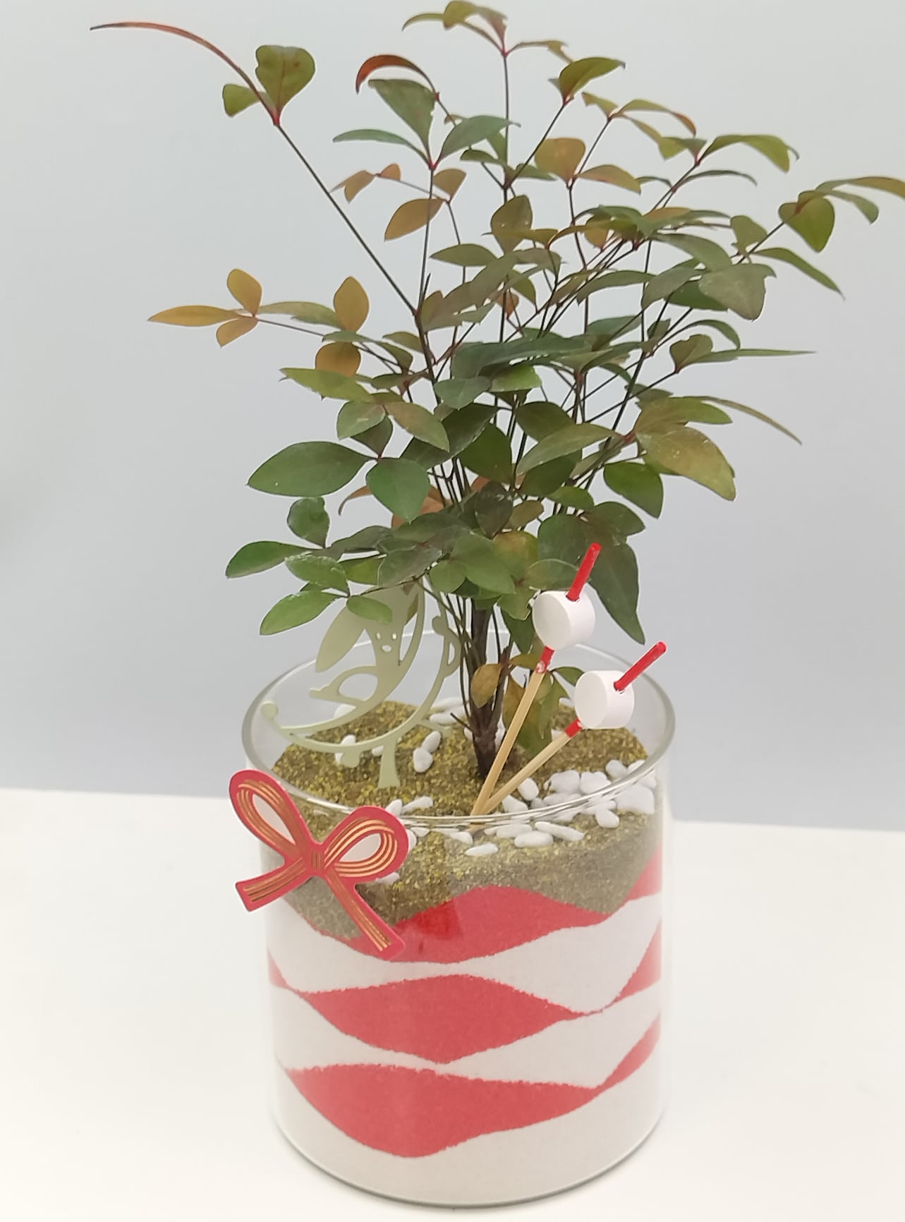 迎春 南天のカラーサンド飾り – 開運の赤白砂庭〈高さ8.0cm × 直径8.0cm〉